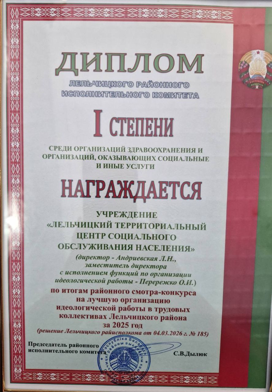 По итогам проведения районного смотра-конкурса на лучшую организацию идеологической работы в трудовых коллективах Лельчицкого района Диплома I степени удостоен коллектив Центра.