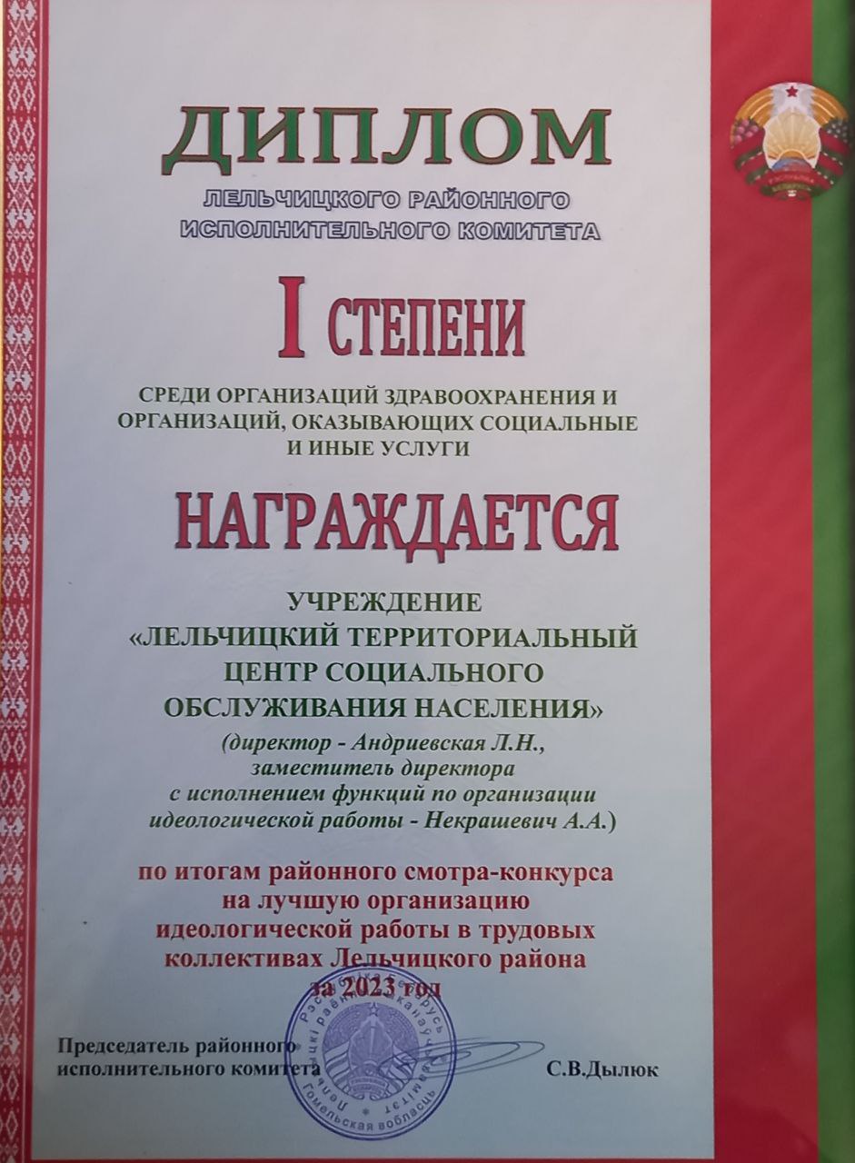 Коллектив учреждения "Лельчицкий территориальный центр социального обслуживания населения " удостоен диплома I степени по итогам районного смотра-конкурса на лучшую организацию идеологической работы в трудовых коллективах Лельчицкого района за 2023 год.